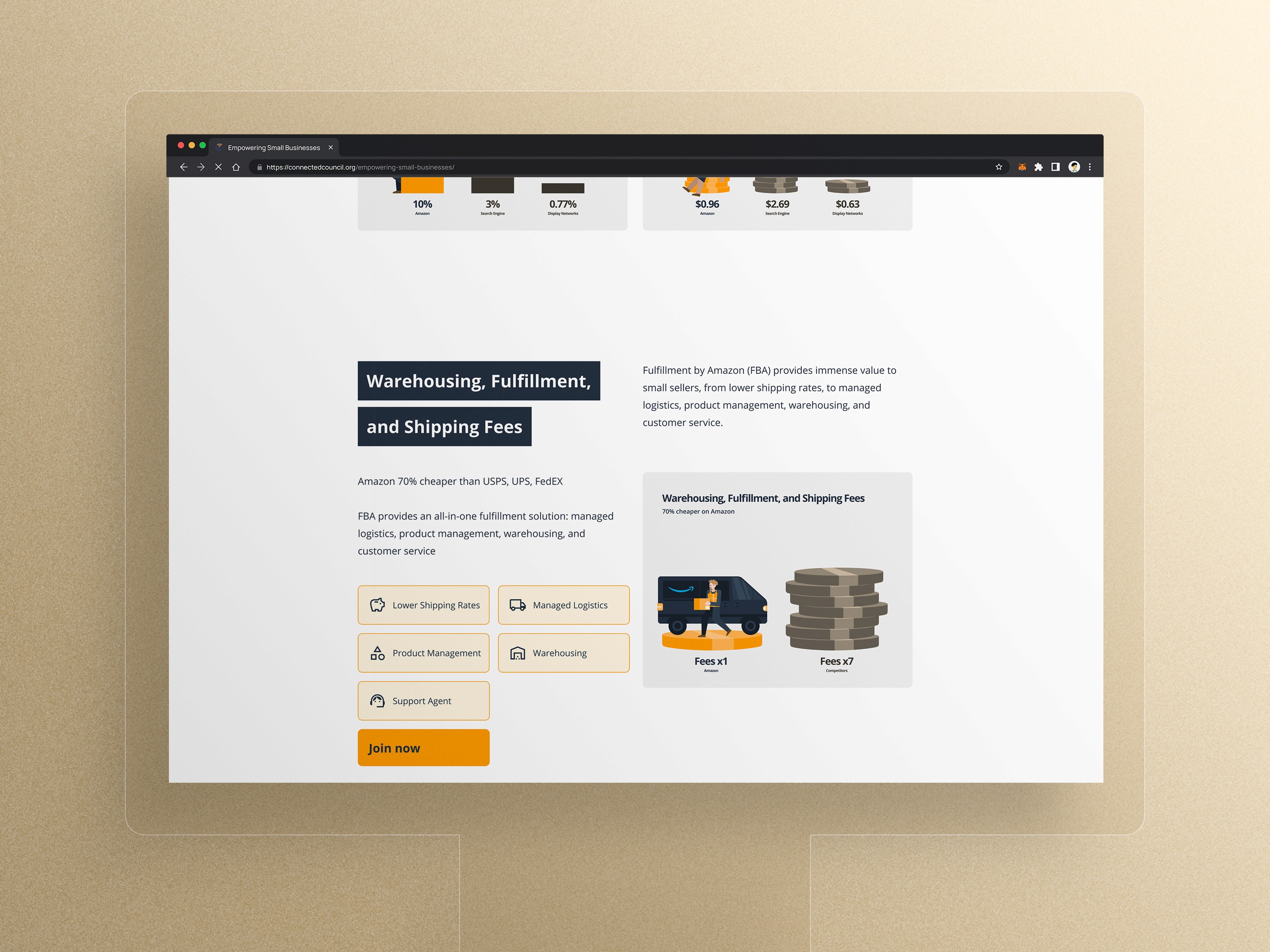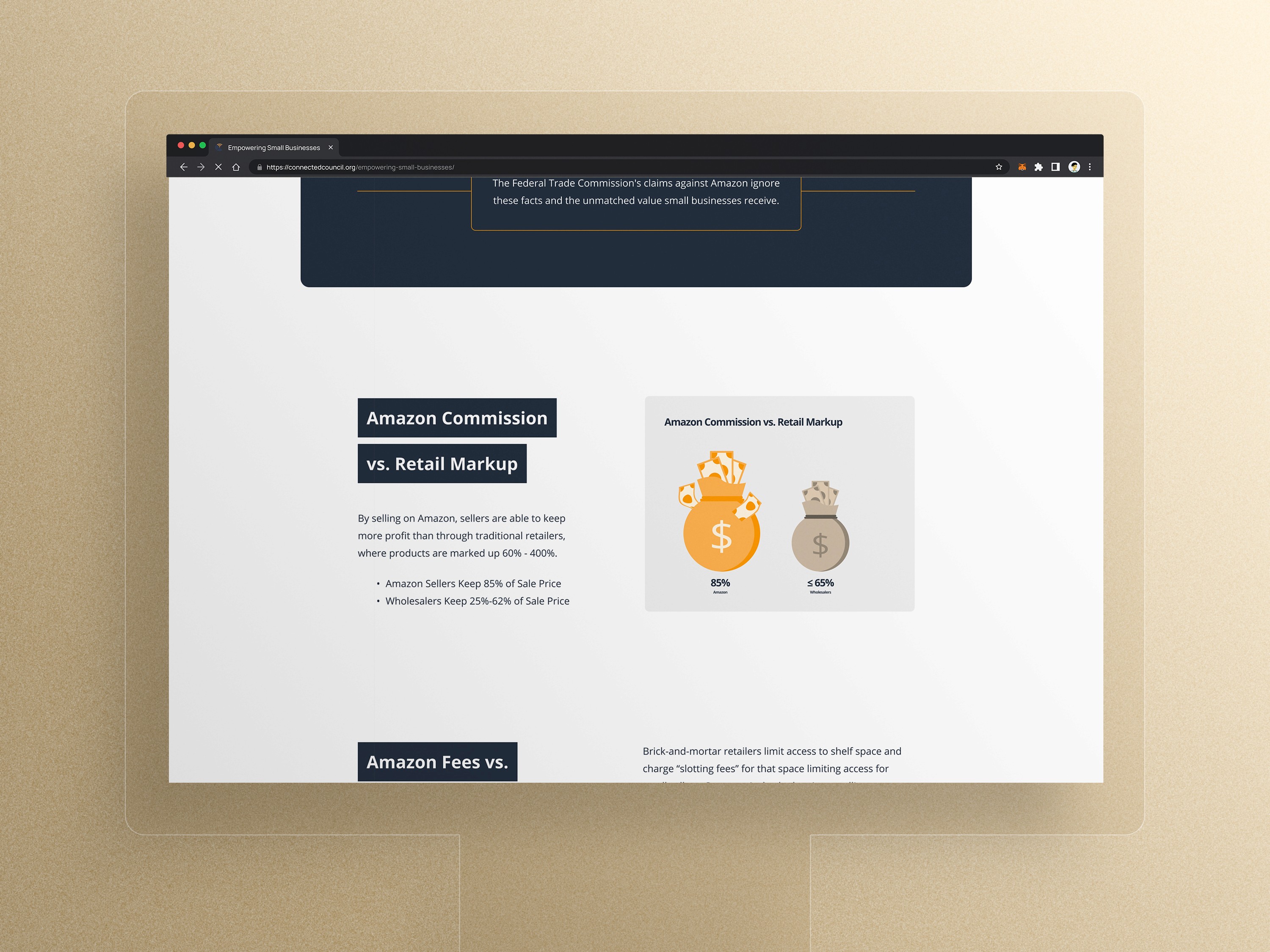 Connected Commerce Council website highlights the value Amazon provides to small businesses by offering cost-effective selling opportunities, low fees, extensive customer reach, and logistical support. It contrasts Amazon’s benefits with traditional retail challenges, advocating for the platform’s role in empowering small sellers.